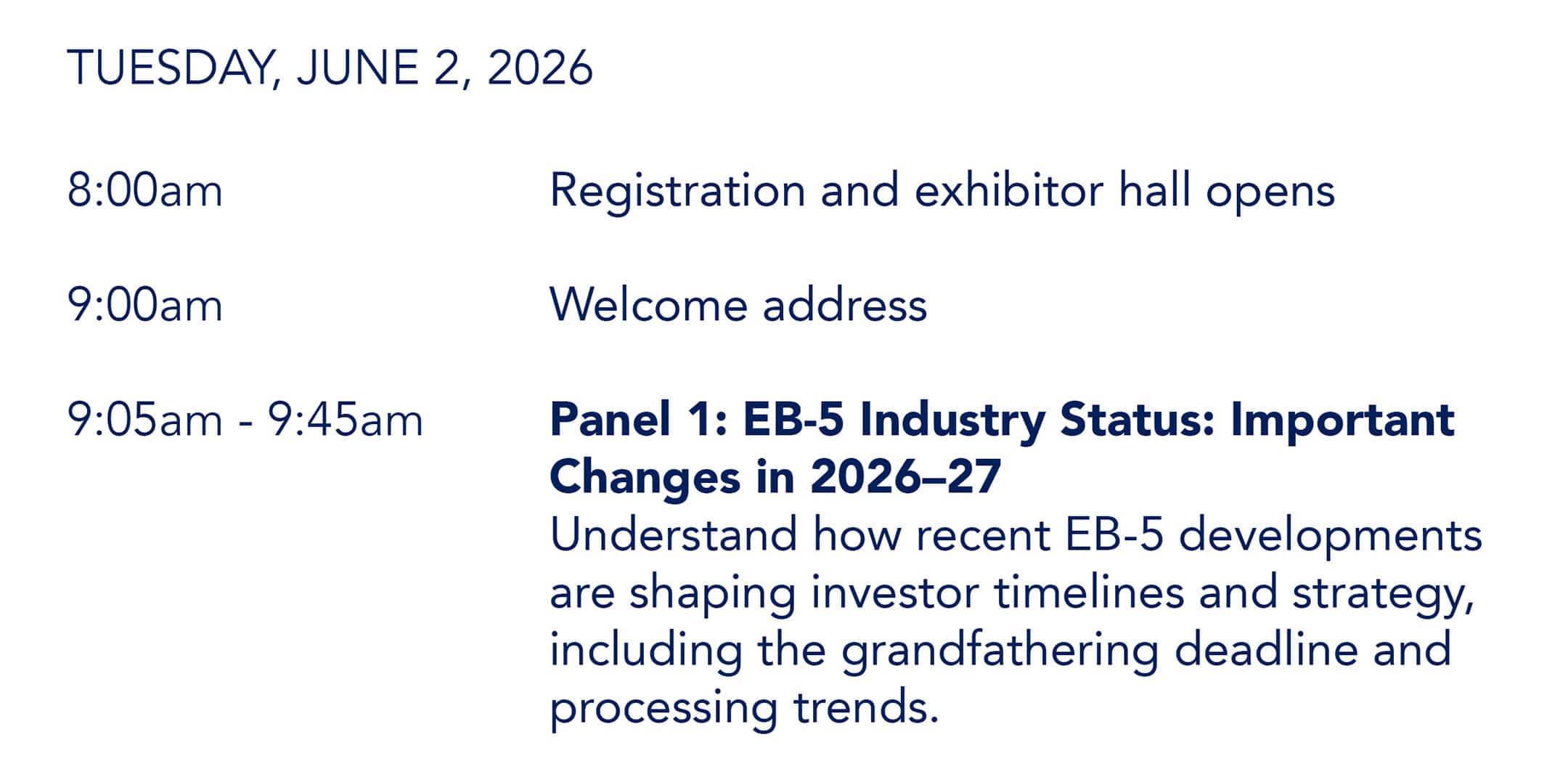 Disclaimer: EB5Investors.com events and conferences are open to the general public and may include persons resident in the U.S. or foreign countries who may be interested in EB-5 investment opportunities. Attendees, exhibitors and speakers at our events and conferences should consult with their own legal counsel regarding compliance with securities laws for any ongoing or planned securities offerings. EB5investors.com provides no legal advice concerning compliance with securities laws by attendees, exhibitors and speakers at its conferences and events.