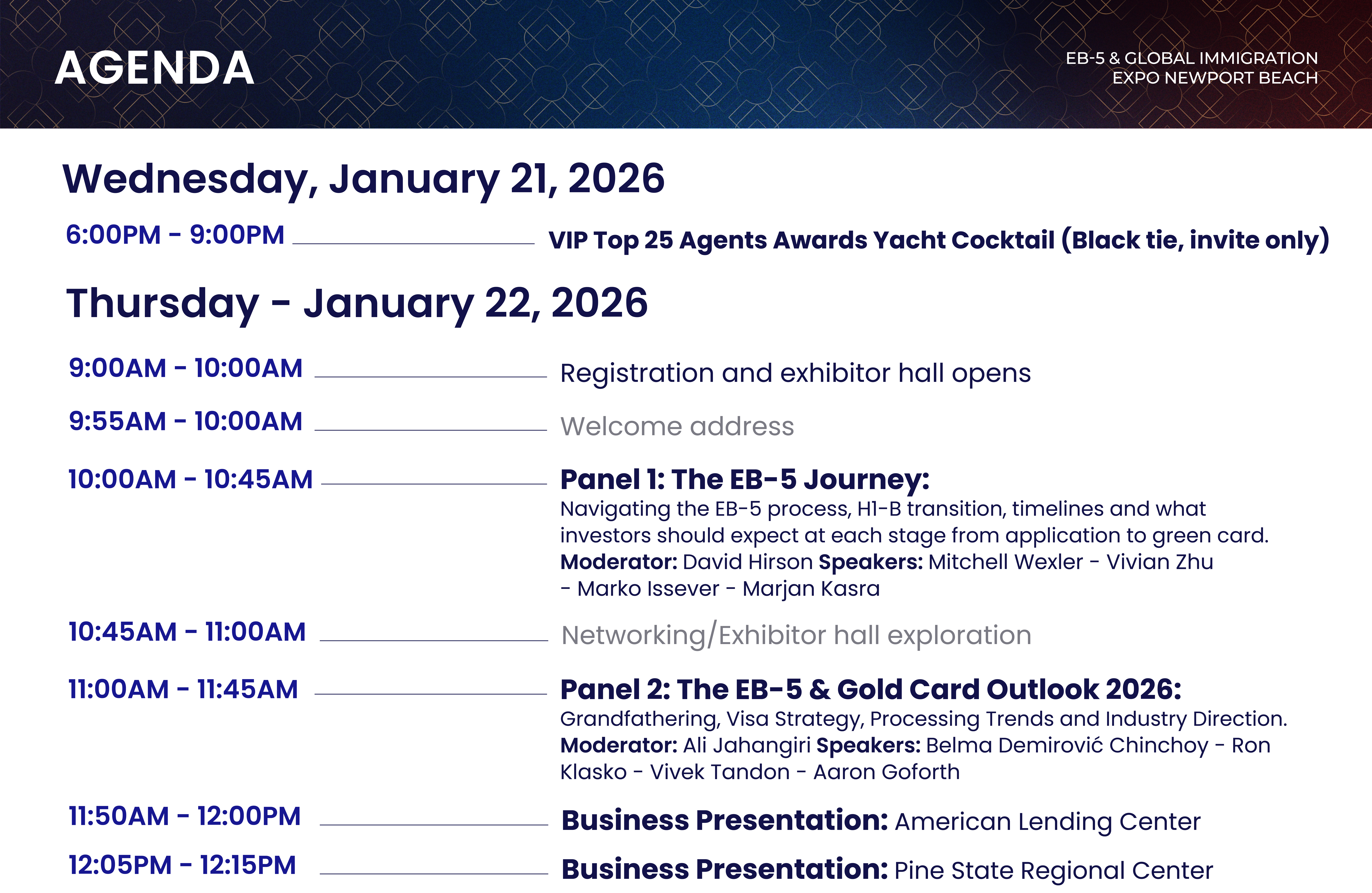 The 2026 EB-5 & Global Immigration Expo in Newport Beach, California will offer high-quality education from industry leaders and is expected to gather global professionals in investment immigration and wealth management. The conference will feature interactive panels moderated by experienced immigration and global migration professionals. The educational panels will cover topics specifically for high net worth individuals, tax and immigration attorneys, migration agents, investors and project developers. The event will also celebrate the distinguished Top 25 winners released in Eb5 Investors Magazine and Uglobal Immigration Magazine.