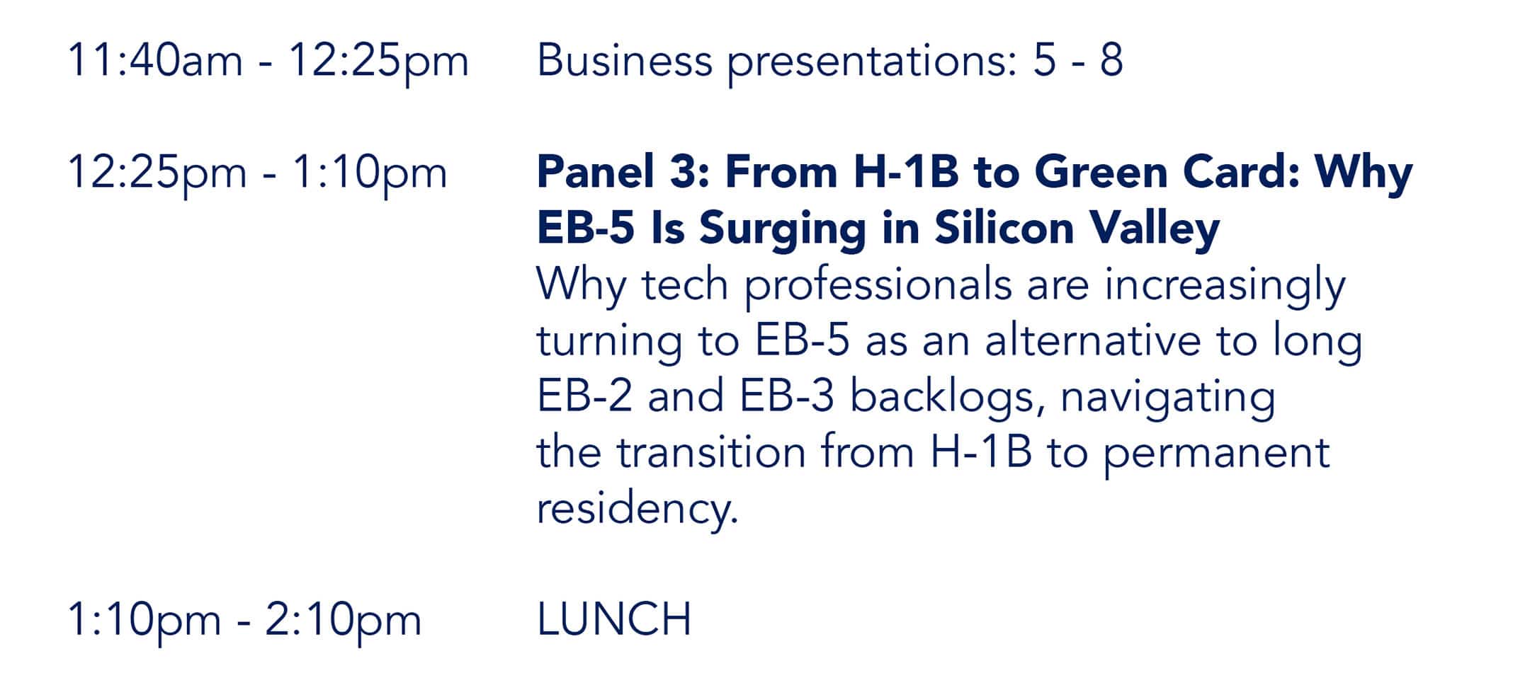 If you’re living in the U.S. on a temporary visa—H‑1B, F‑1, OPT, L‑1, or others—and exploring a direct path to a Green Card, the EB-5 & Global Immigration Pitch Day in Silicon Valley is designed just for you.